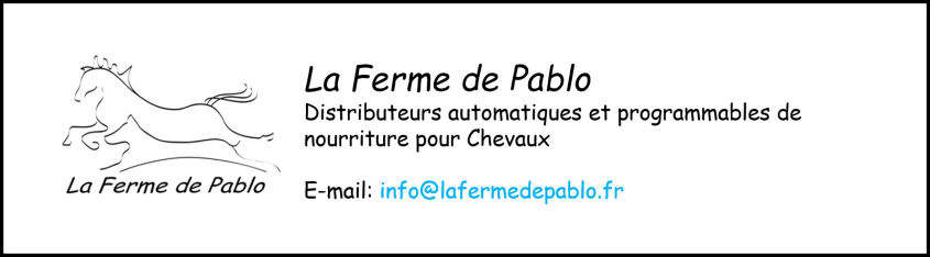 Cet endroit porte le nom de mon fils « Pablo ». Il est tout comme moi passionné de chevaux, et c’est dans nul doute nos deux passions réunies qui ont été l'une de mes plus grandes motivations pour mettre au point ce produit. Aujourd'hui, nos distributeurs pour chevaux sont suffisamment matures pour nous permettre d’attaquer le marché national et aussi l'international avec une garantie que nous assurons à tous nos clients, ainsi qu'un service après-vente irréprochable.